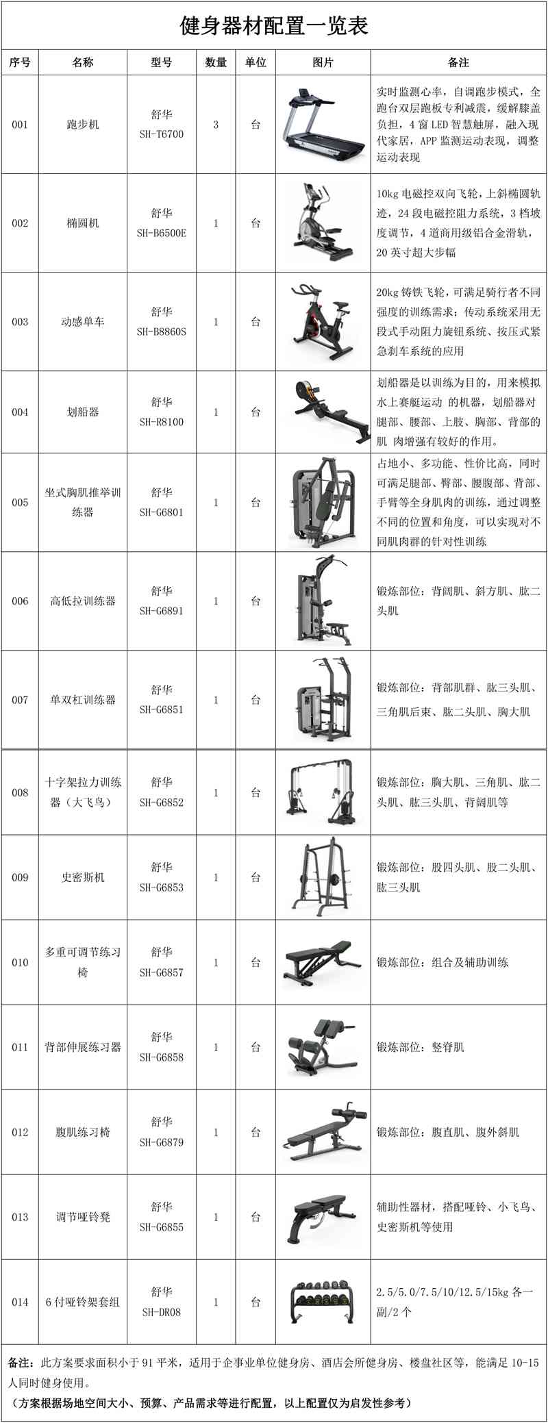 此方案要求面积小于91,适用于企事业单位、酒店会所、楼盘社区、学校等健身场所,能满足10-15人同时健身使用。(方案根据场地空间大小、预算、产品需求等进行配置仅为启发性参考)