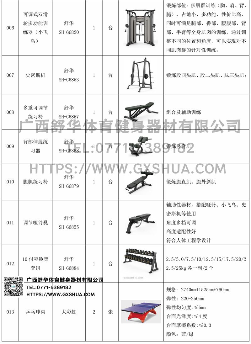 6.haobotiyu-好博可调式双滑轮多功能训练器(小飞鸟)SH-G6820*1台-锻炼部位:多肌群训练(胸、肩、背、腿),占地小、多功能、性价比高,同时可满足腿部、臀部、腰腹部、背部、手臂等全身肌肉的训练,通过调整不同的位置和角度,可以实现对不同肌肉群的针对性训练;可搭配不同配件,拓展多种训练方法,提供针对性训练、多种组合等训练方式,全方位激活身体机能。