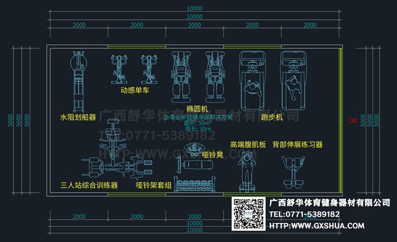 此方案要求面积小于50m²,适用于企事业单位、酒店会所、楼盘社区、私教工作室等健身场所,能满足10-15人同时健身使用。(方案根据场地空间大小、预算、产品需求等进行配置仅为启发性参考)