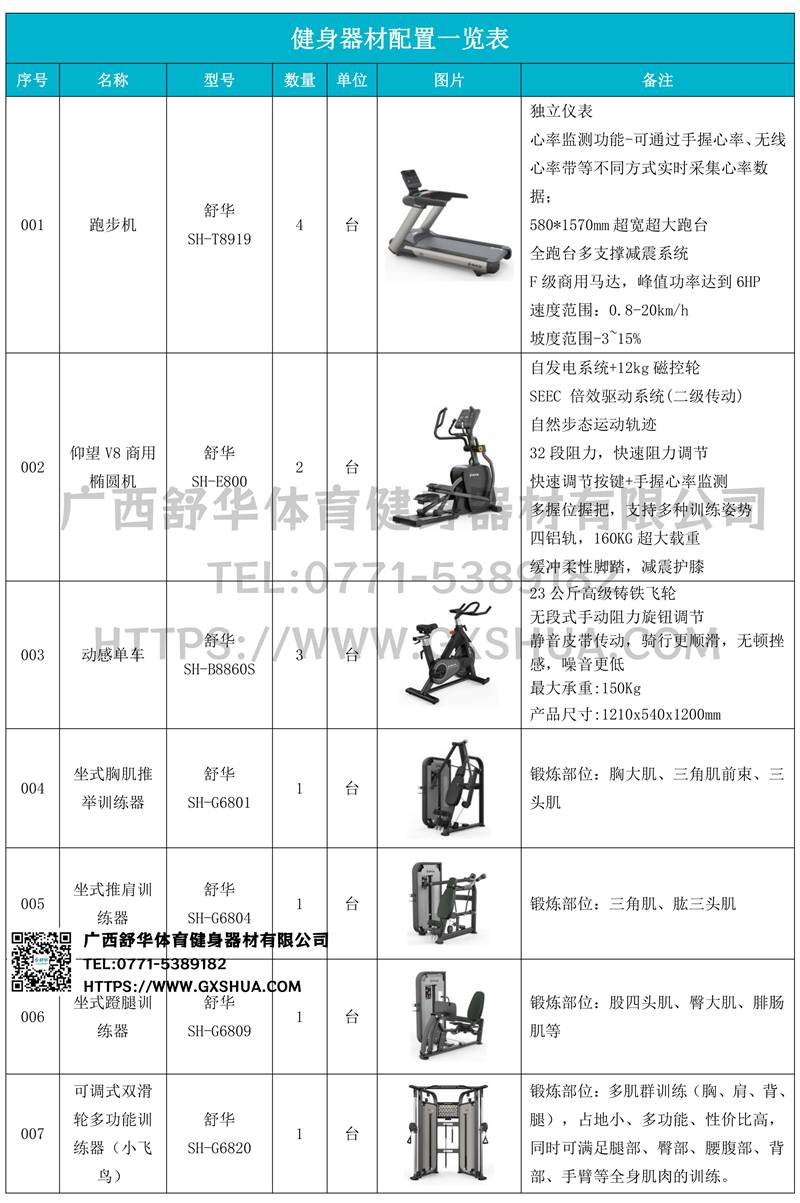 坐式胸肌推举训练器(1台)、坐式推肩训练器(1台)、坐式蹬腿训练器(1台),可满足胸部、腿部、手臂等肌肉的训练,通过调整不同的位置和角度,可以实现对不同肌肉群的针对性训练。