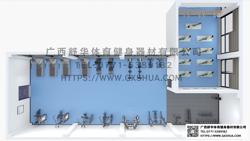 此方案要求面积小于206m²,适用于企事业单位、酒店会所、楼盘社区、工作室、学校等健身场所,能满20-30人同时健身使用。(方案根据场地空间大小、预算、产品需求等进行配置仅为启发性参考)
